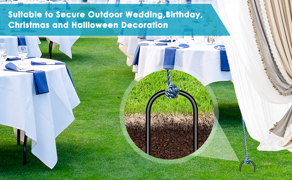- MULTIPLE USES:These trampoline tie down anchor kit can help to hold down the swing sets, trampoline, soccer goals, camping tents,hammock slides, fences, yard decorations, huge Christmas Outdoor Decoration, nets, large canopy, inflatable outdoor yard decorations,tarps,soccer nets, landscape edging, garden trellises and more.