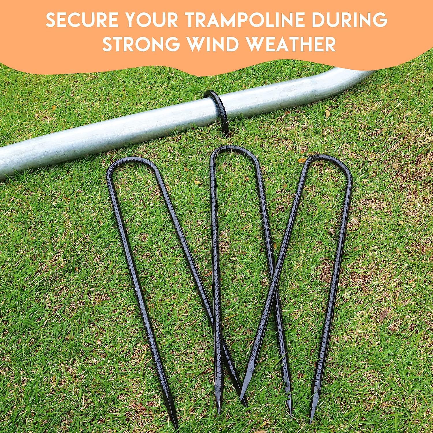 - TRAMPOLINE STAKES KEEP TRAMPOLINE IN PLACE - If you have a trampoline, it is necessary to add these trampoline stakes to reinforce and keep it in place when the trampoline is used, especially in the place always meet hurricane or other strong winds. These ground anchors will keep your trampoline from flipping or moving during use, and kids will not fall off or hit to ground.
